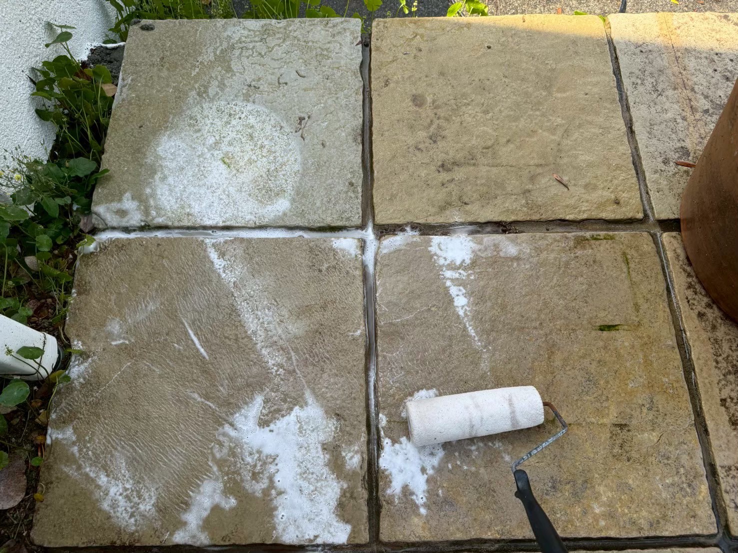 石材用の専用薬品を使用した洗浄を行っていきます。