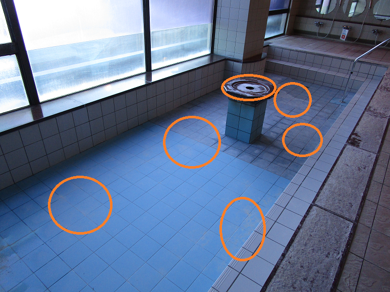 お湯が張ってある状態だと一見キレイに見えますが、水を抜いてみると、オレンジの丸で囲った箇所には白い温泉成分の汚れが見えてきます。また、浴槽周りにあるごつごつした石は赤御影石です。赤御影石は本来濃い赤色をしているのですが、温泉成分の汚れによって白くなってしまっているのが分かります。
