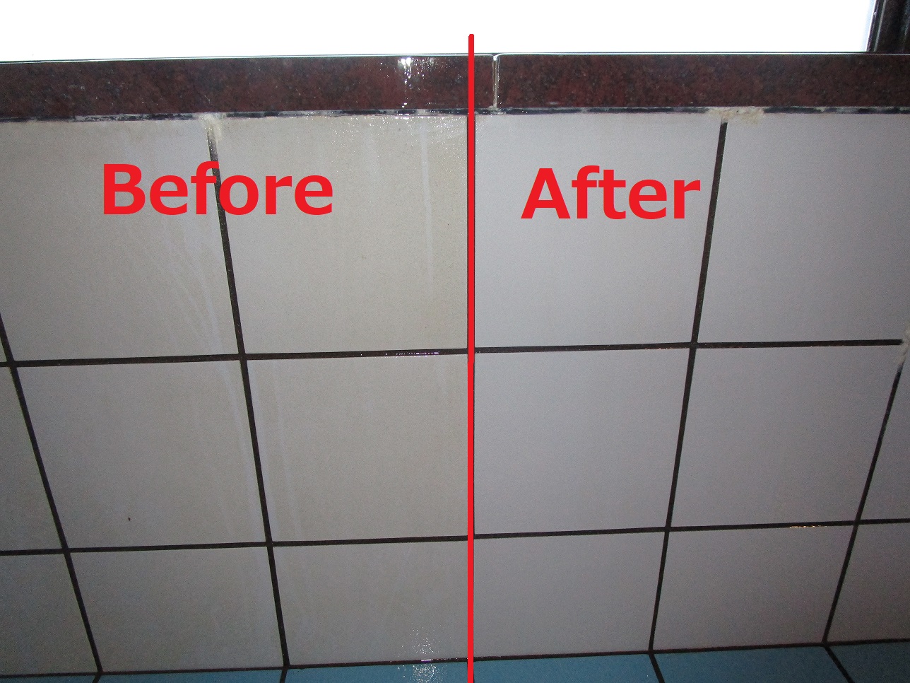 青いタイル部分にも汚れがこびりついていましたが、研磨していくと、