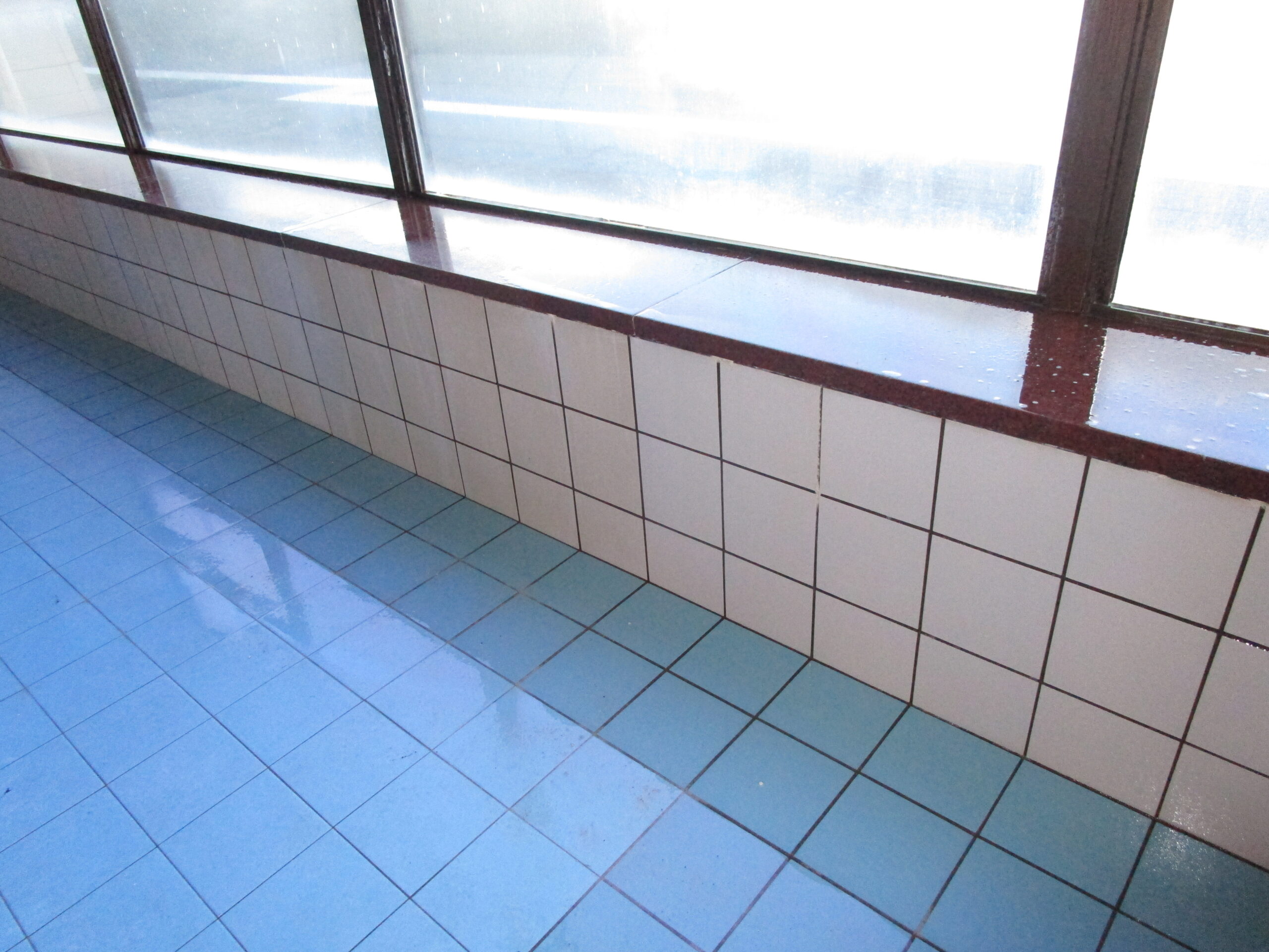 旅館にある大浴場のタイルと赤御影石の水垢(温泉成分の汚れ)落とし【三重県鳥羽市】