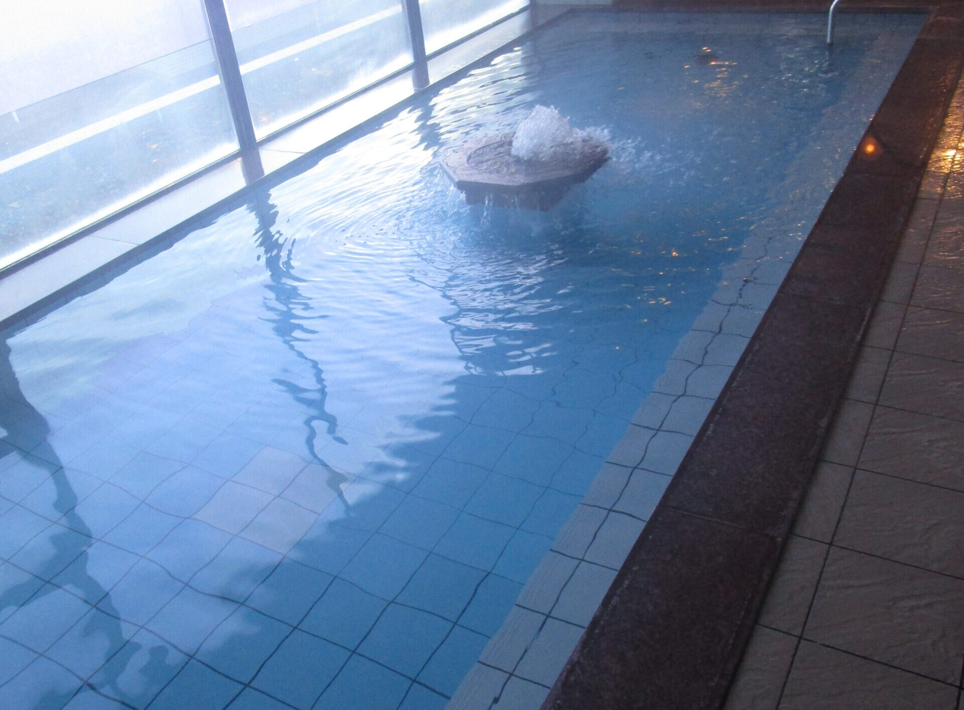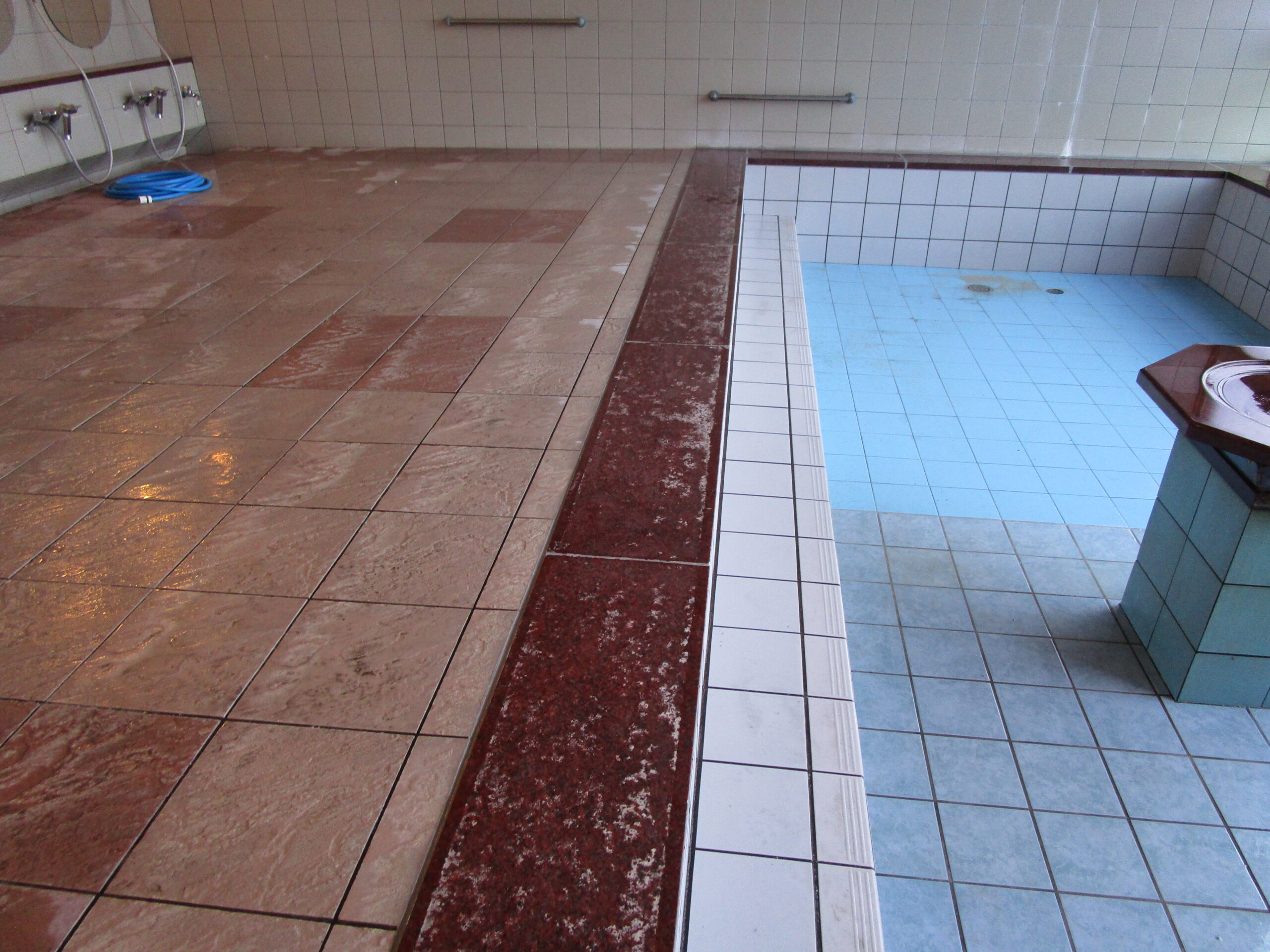 それでは、こちらの大浴場のタイルと赤御影石の研磨をすることによって、温泉成分の汚れを取っていきますよ✊