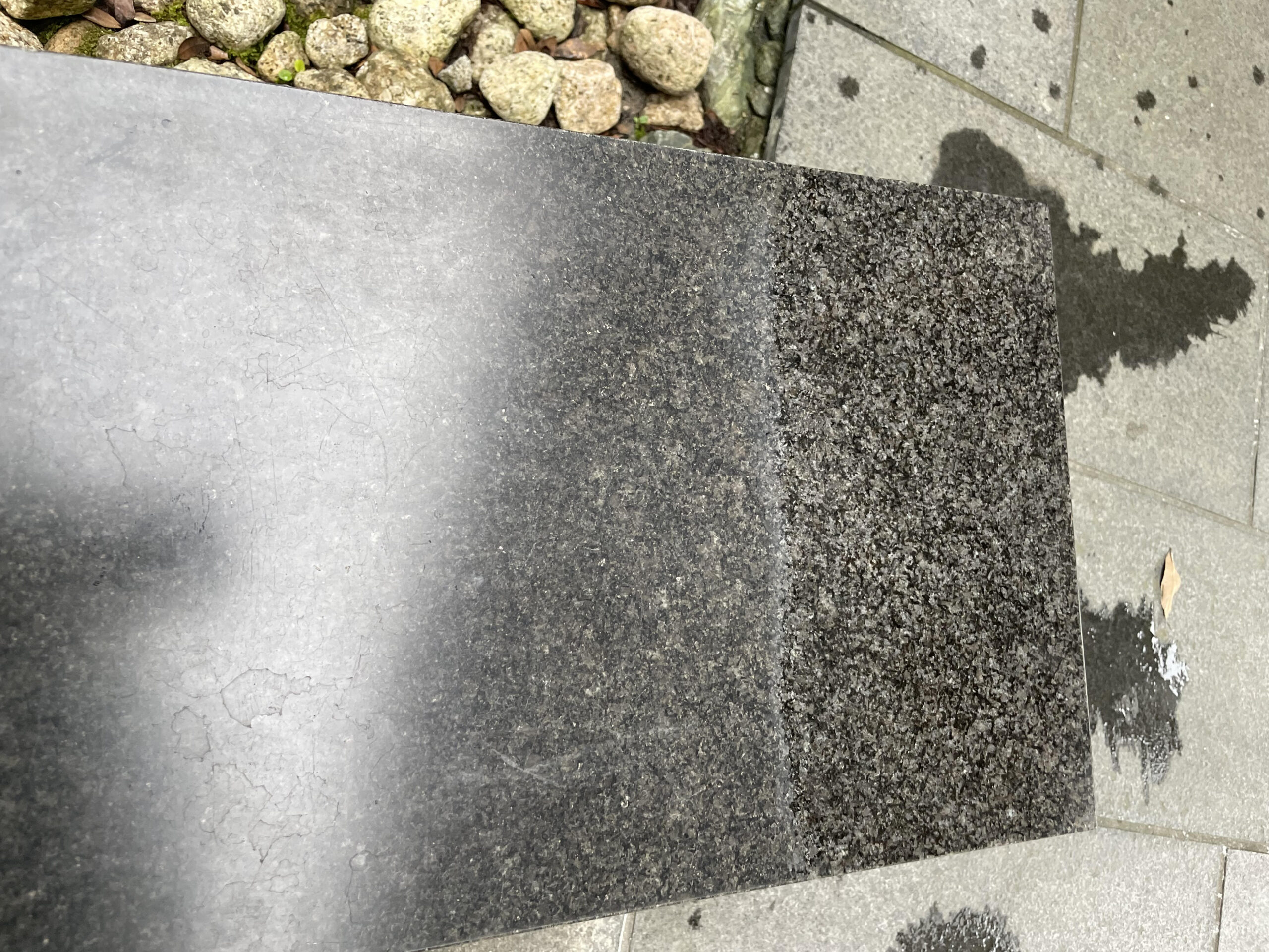 御影石のメンテナンスの施工後は白い濁りがなくなり、ツヤが戻ってきました。