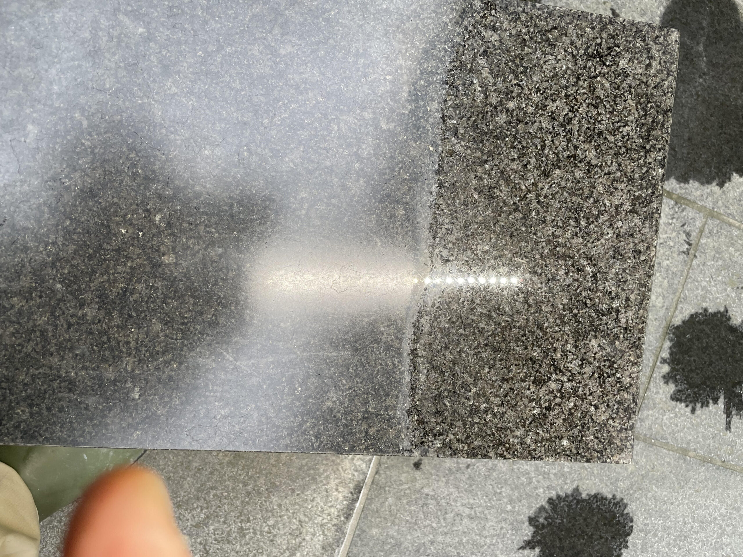 雨が降っていたので、御影石に映った傘が写真に入り込んでしまいました😓ですが、この写真が示すように、コーティングをしても鏡のように前の物を映し出す光沢を保てているんです✨