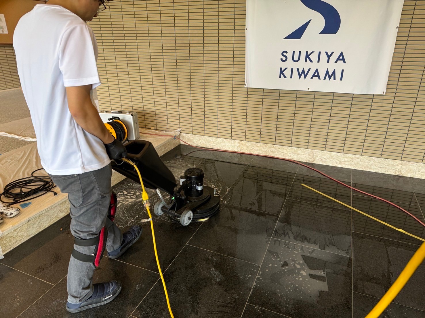 玄関ホールの御影石は、本磨きの御影石を表面の汚れを落としてから、ツヤを戻すための研磨作業をしました。